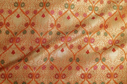 This yam orange Benares silk has a beautiful thread work pattern in gold zari, seaweed green, magenta and blood red. This fabric looks festive on its own and doesnêt need any other accessory.