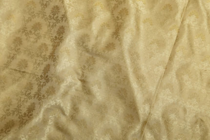 This elegant benares silk is beige colored with tan floral thread work all over with gold zari floral bhuttas giving this fabric a regal finish.
